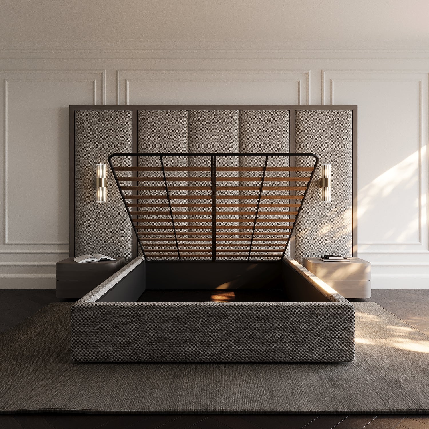 A multifunctional base with hidden storage and a gas-lift mechanism for effortless access. Perfect for smaller spaces or anyone needing extra storage without sacrificing style. Ideal for apartment dwellers or those looking to keep their bedroom clutter-free.