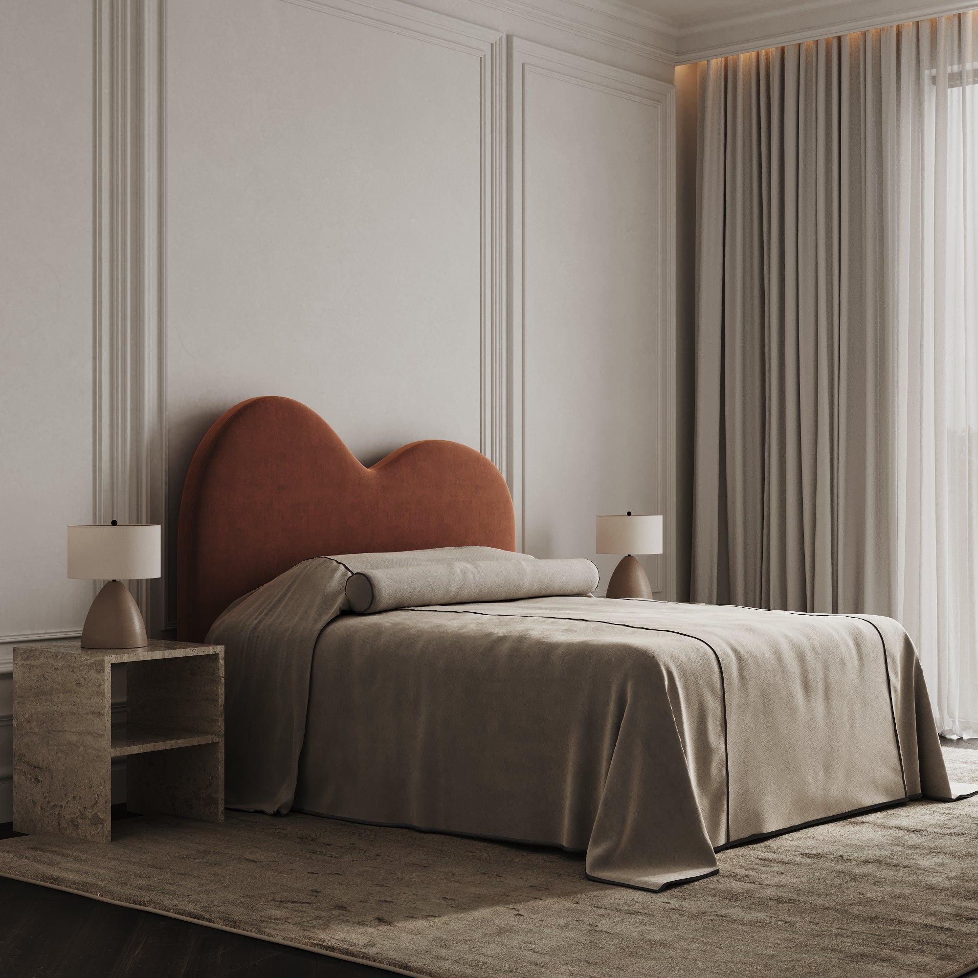 Available in a range of premium fabrics and colours—from calming neutrals to rich, earthy hues—this headboard can be customised to suit any interior style. The luxurious upholstery ensures comfort and durability, making it as practical as it is beautiful.