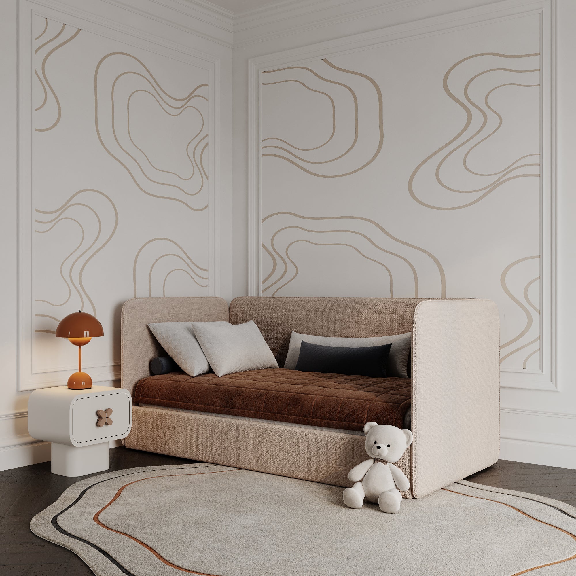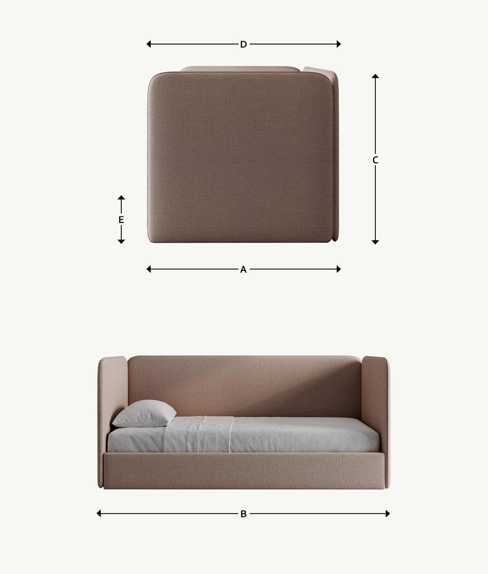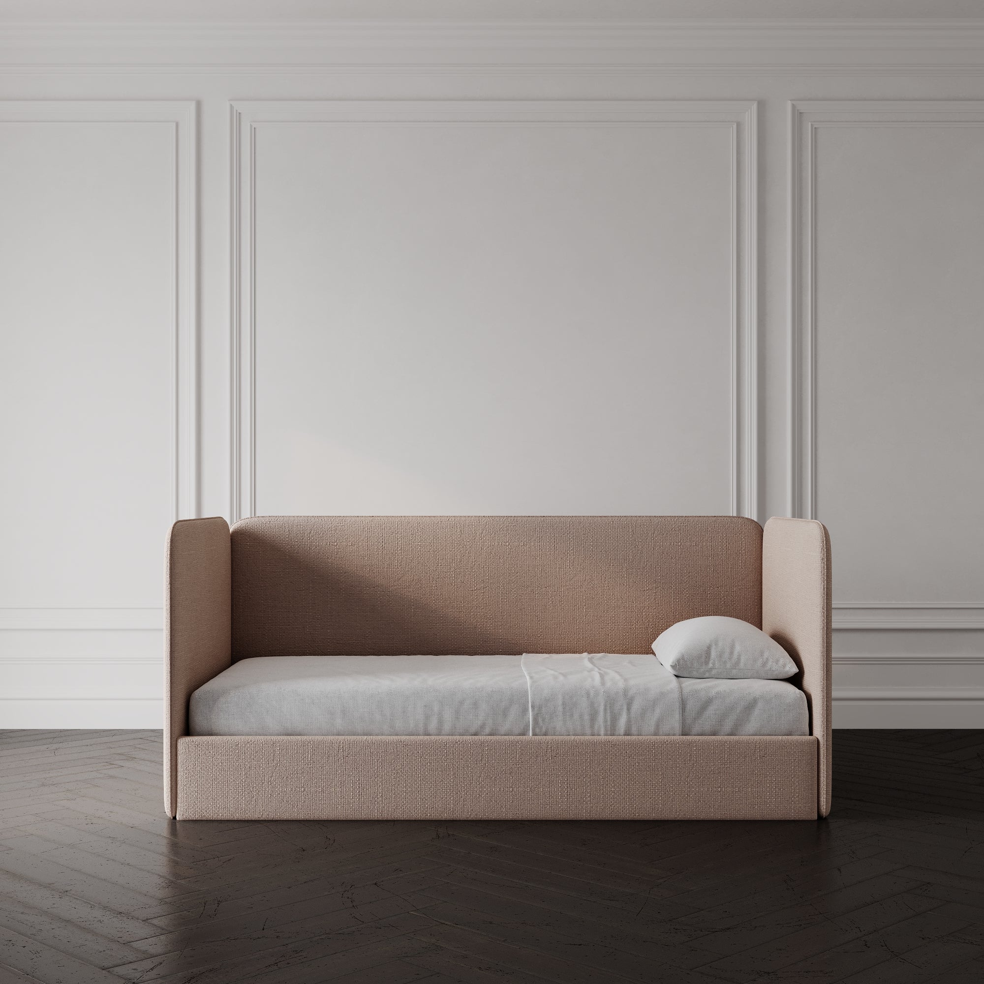 The Nestle Bed is a minimalist and cozy children’s bed designed for both style and comfort. With its wraparound upholstered frame, it creates a snug, cocoon-like feel, making it the perfect retreat for restful nights and daytime lounging. The high, softly padded side panels provide an extra layer of security, making the Nestle Bed ideal for toddlers transitioning to their first big bed while still offering a stylish, grown-up aesthetic.