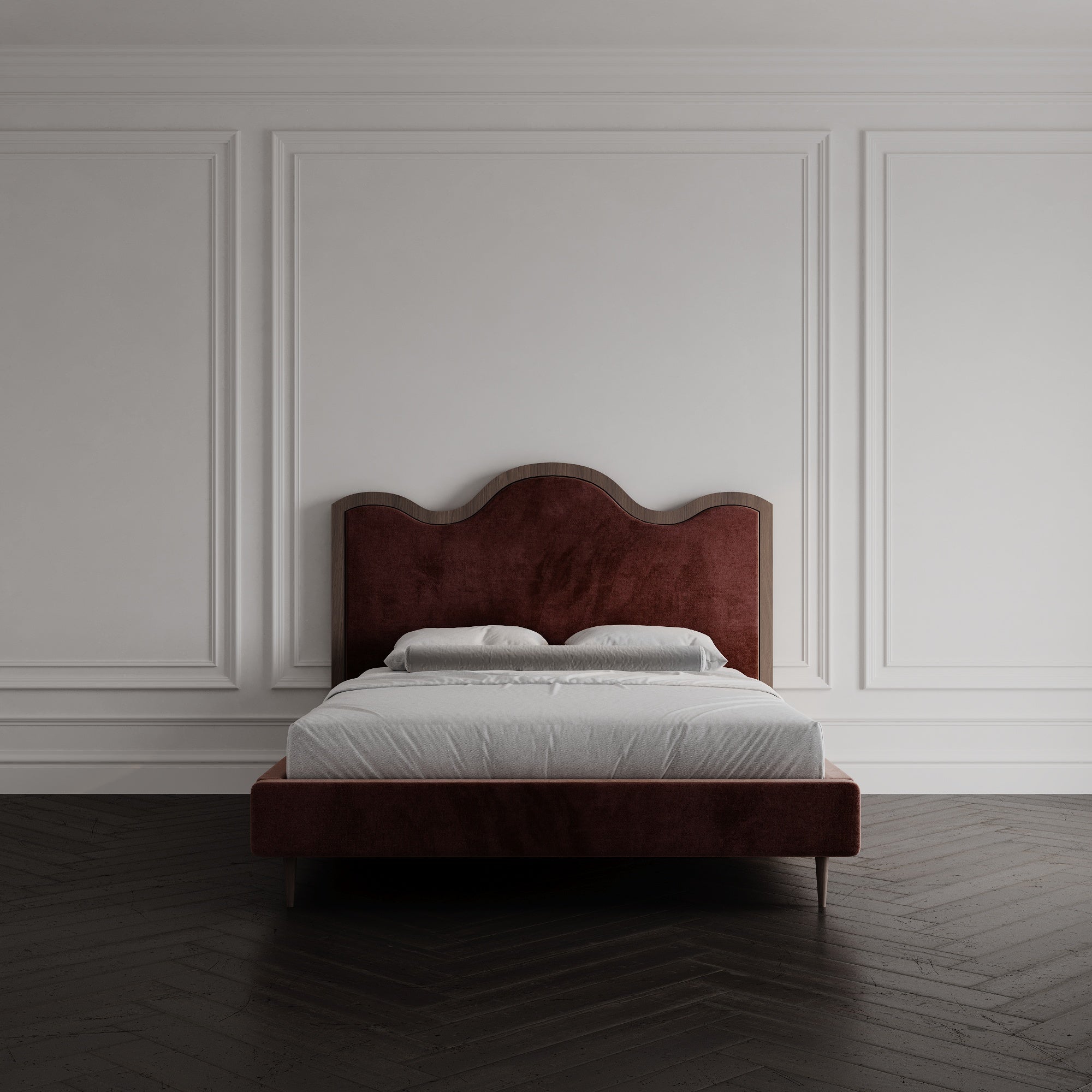 The Saville Bed exudes timeless sophistication with its gracefully curved headboard and rich, upholstered finish. The sculpted silhouette brings a touch of classic refinement, while the deep-toned fabric adds warmth and depth to any space. Designed to be both a statement piece and a retreat, the Saville Bed seamlessly balances traditional charm with modern simplicity. Its plush, fully upholstered frame enhances comfort, making it the perfect choice for those who appreciate luxury and craftsmanship in their bedroom.